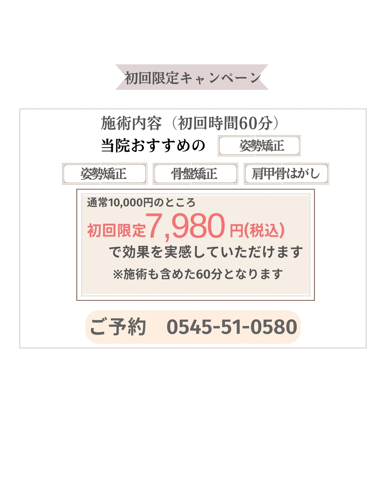 初回時の症状は、腰や下半身のだるさでした。明らかな猫背姿勢や下半身の捻じれがあったので、そこからの腰痛と判断して、全身の姿勢を整えていきました。効果がはっきりと、感じて頂いたのでとても嬉しかったです
